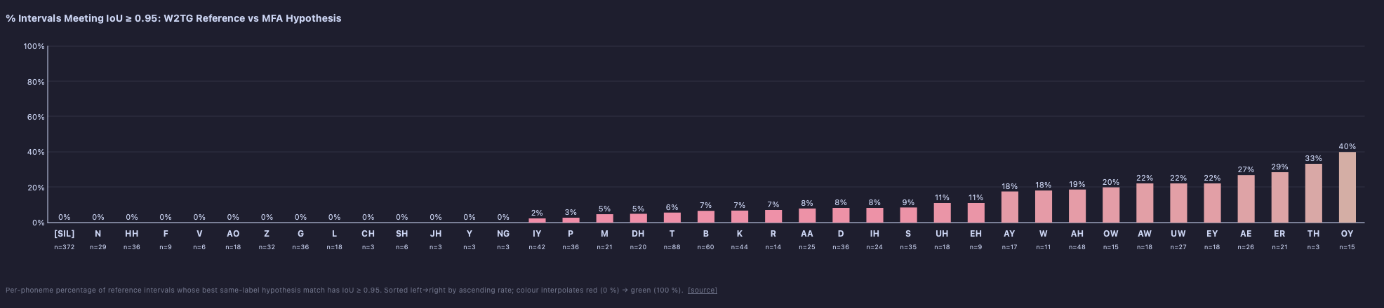 Percentage of reference intervals whose best same-label hypothesis match meets an IoU threshold. Bars sorted ascending left→right; colour interpolates red → green.