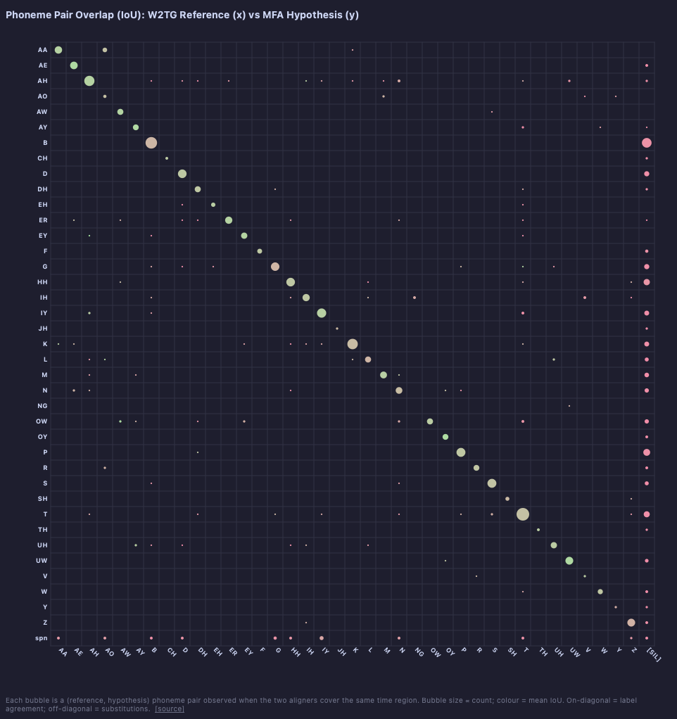 Grid scatter of (reference phoneme, hypothesis phoneme) pairs. Bubble size is proportional to observation count; colour represents mean IoU (red → green). On-diagonal bubbles indicate label agreement; off-diagonal bubbles indicate substitutions.