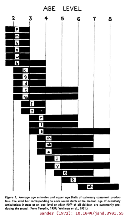 Sander (1972) set out to construct a set of developmental norms for typical consonant acquisition in English. His big idea was to include the median age of acquisition as well as the 90th percentile age of acquisition. The median can tell us something about the average acquisition of the speech sounds, and the 90th percentile can set a benchmark for delayed acquisition. There are some quirks of the methodology. First, Sander (1972) was targeting "customary articulation" which was defined using production accuracy average across word positions. So, the age of 50% customary articulation for /t/ is the earliest age when the average of word-initial accuracy, word-medial accuracy and word-final accuracy is greater than 50%. Second, the norms for this study were created by augmenting data from 3–8-year-olds (Templin, 1957; n = 480) with some earlier data for 2-year-olds (Wellman et al. 1931; n = 15).