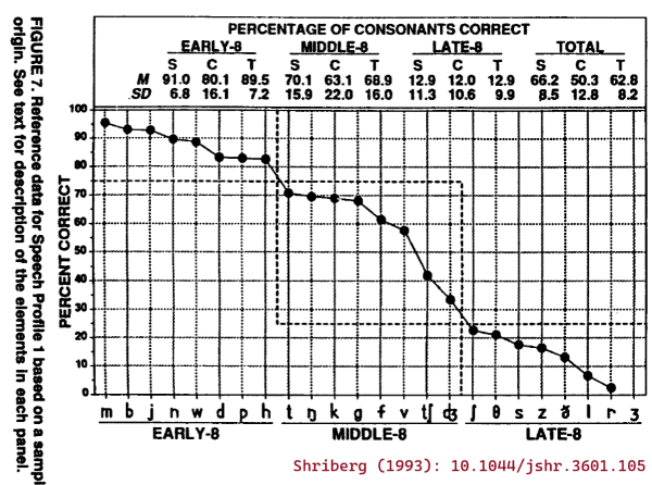 About which, Shriberg (1993) says: "The values for this trend, which is a profile of consonant mastery, were taken from a group of 64 3- to 6-year-old speech-delayed children Shriberg, Kwiatkowski, & Gruber, 1992). Severity of involvement of the 24 English consonants is represented as the percentage correct for each consonant sorted in decreasing order from left to right. Notice that the most obvious breaks in this function allow for a division of the 24 consonants into three groups of eight sounds termed the Early-8, averaging over 75% correct, the Middle-8, averaging 25%-75% correct, and the Late-8, including consonants averaging less than 25% correct in continuous conversational speech (/ʒ/ is infrequently represented in young, speech-delayed children's spontaneous conversational speech)."